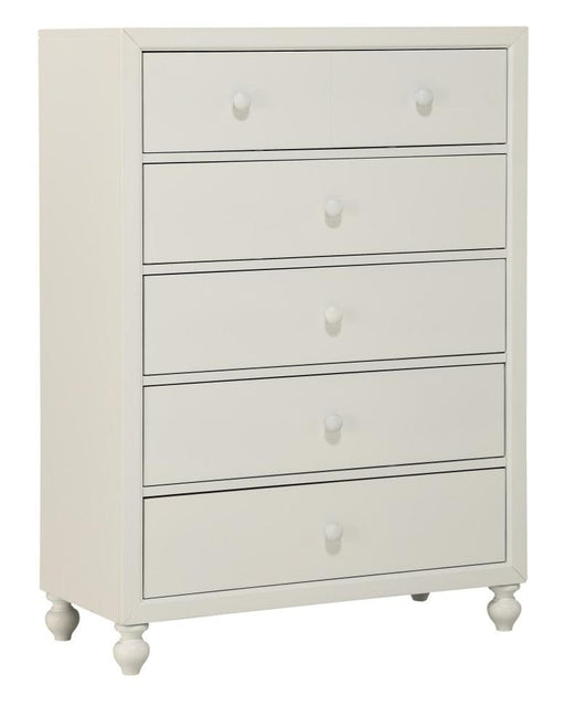 Homelegance (Homerica East)Wellsummer Collection by Homelegance Furniture White finish Made of man-made wood 5 Drawers White tone wood knobs Dovetailed drawers Metal on meta...