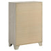 This four-drawer chest offers a stylish combination of rustic charm and modern design, making it a perfect storage solution for contemporary bedrooms. Finished in a rustic cream with rough-sawn, white-washed engineered paper veneer, it has a warm, textured appeal that’s both inviting and chic. The extra-wide polished nickel handles add a sleek, modern touch, creating a subtle contrast. Built with engineered wood, the chest features English dovetail joinery and Center metal glides for durability and smooth functionality, ensuring it meets both aesthetic and practical needs.