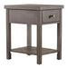Liberty Furniture Modern Farmhouse Chair Side Table in Brown 406-OT1023. Enhance your space with the Modern Farmhouse drawer chair side table. Crafted of poplar solids with knotty white oak veneers, this piece features a dusty charcoal finish with heavy distressing, a full extension drawer with a bottom shelf for additional storage, appealing washed brass knob hardware. Also available in an alternate finish, this modern farmhouse piece would be a wonderful addition to your cottage or contemporary style space.