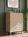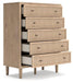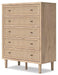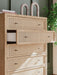 - Framed drawer fronts with textured beige finish that replicates the look of cane