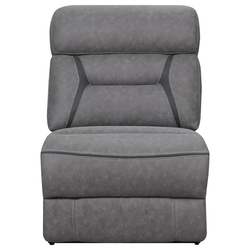 This left-arm facing power reclining loveseat offers premium comfort and functionality within a modular sectional. Upholstered in soft grey microfi...
