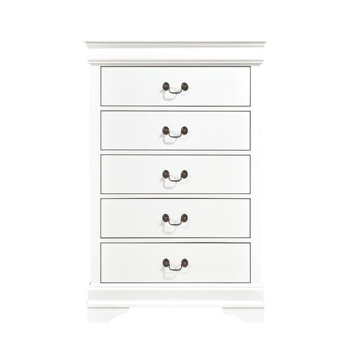 Homelegance (Homerica East)Mayville Collection by Homelegance Furniture White finish 5 Drawers Antiqued metal bale hardware Distinct framing