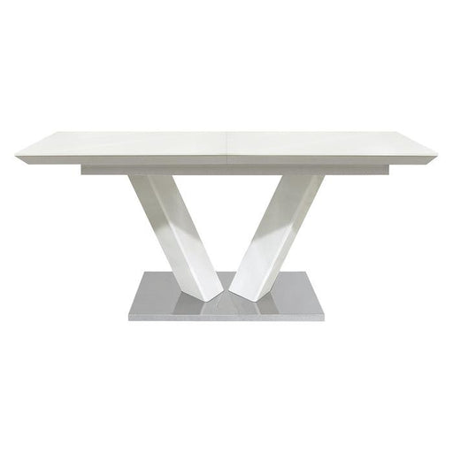 Homelegance (Homerica East)Yannis Collection by Homelegance Ultra-bright high gloss finish Manmade wood table top V-shaped support with chrome base plate Self storing butter...