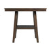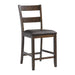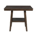The Laredo 5PC Dining Set is ideal for small space living! This counter height set includes a table and four chairs. The table features a square design and comes with a shelf in the middle. Use the shelf to store away extra dishes or display your favorite decor piece. The side chairs come with an upholstered seat and a ladder back design. The chairs cushions come in a fashionable, faux leather chocolate that pairs well with the dark walnut finish. Add this dining set to your home today for an instant update. - Includes: Table & Four Chairs - Counter Height - Square Table Design - Shelf in Middle of Table - Faux Leather, Chocolate Upholstered Seats - Ladder Back Chair Design - Foam Cushion Seat - Dark Walnut Finish Acacia Solid Wood MDF with Acacia Veneer Corner Leg Cleat Plywood D x W x H, 130lbs. 1 Year Limited Manufacturer Warranty
