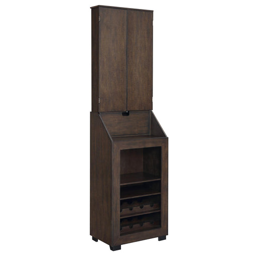 The Bones Dartboard Cabinet is a multi-functional gaming piece for your game room. This beautiful gaming cabinet has so much to offer. Open up the cabinet doors and you will find a dartboard, two score boards, three red darts, three blue darts and 1 dry Erase Marker for score keeping. Perfect for home entertainment and beverage service, this piece has an eight-bottle wine rack on the bottom and 2 shelves for additional storage for glassware. The rich walnut finish of this piece gives it a traditional style appearance perfect for a game room. So, call your friends and family over for a game night party! - Standard Dartboard - Black Felt backing - Three Red Darts - Three Blue Darts - Two Score Boards - Gel Pen for Scorekeeping - Eight Bottle Wine Rack - Drop Down Storage Shelf - Ships in One Box MDF with Acacia Veneer Engineered Wood Solid Wood Felt 23 D x 85 W x 13 H, 120lbs. 1 Year Limited Manufacturer Warranty