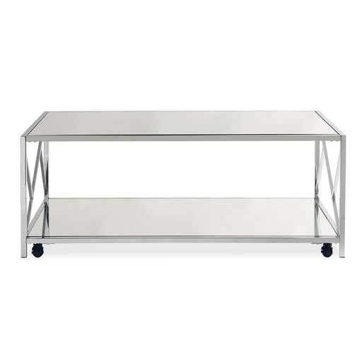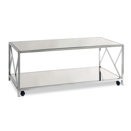 Braden 3PC Occasional Table Set - Includes: Coffee Table & Two End Tables - Chrome Finish - Intricate Design on Outer Legs - Mirror Table Top and Bottom Shelf on Coffee Table - Mirror Table Top on End Table - Modern Glam Design - Square End Tables - Rectangle Coffee Table - Removable Casters on Coffee Table 3mm Mirror Metal 0 D x 0 W x 0 H, 87lbs. 1 Year Limited Manufacturer Warranty