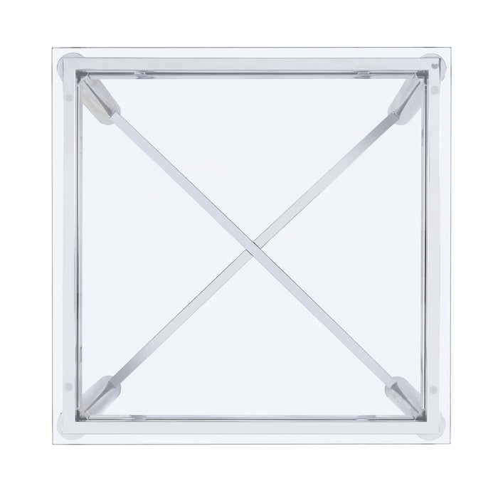Savannah End Table - Contemporary Design - Glass Table Top - Metal Base - Chrome Finish - Square End Table - Cross Stretcher Base Glass Metal 24 D x 24 W x 24 H, 34lbs. 1 Year Limited Manufacturer Warranty