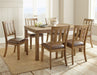 - Beefy linear table post and schoolhouse-style chairs with flared leg