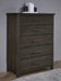 Vaughan Bassett Dovetail 5-Drawer Chest in Java 750-115. Vaughan Bassett has developed a patent-pending process that allows them to accelerate how wood ages. We have kept the splits; knots; cracks; and the bold grain pattern found in Oak lumber to create this reclaimed look in this beautiful and unique bedroom.